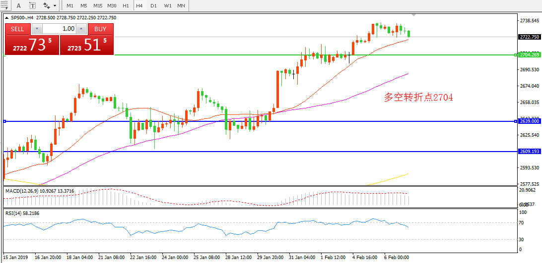 4小时图看,SP500在整理后延续上行走势,21均线逐渐上线形成支撑,MACD红柱走平,RSI指标有掉头家乡,短期可能有所回应,单方向依然偏多。
