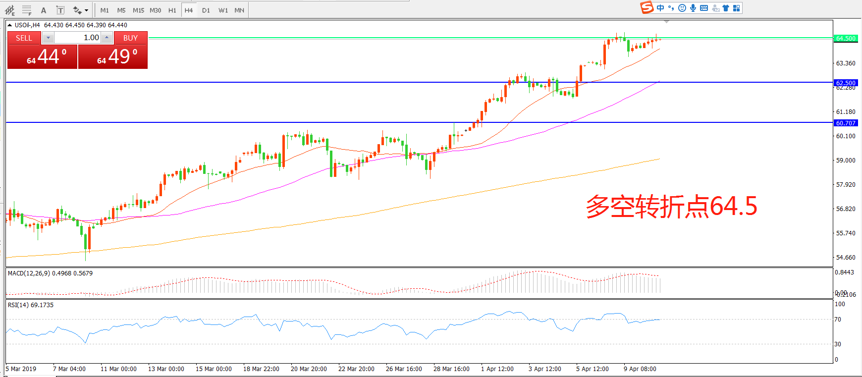 周三,美国能源信息署EIA报告显示,美国4月5日当周原油库存增加702.9万桶,高于预期的增加250万桶,创2017年11月份以来新高。但汽油库存减少771万桶, OPEC发布月报显示,受美国制裁以及电力故障的影响,委内瑞拉3月原油产量已经降至长期新低,这令全球原油供应进一步下滑。抵消了原油库存数据的利空影响。美油窄幅震荡后收报64.44美元/桶。