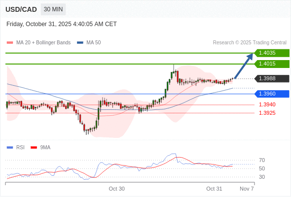 在 1.3960 之上,看涨,目标价位为 1.4015 ,然后为 1.4035 。