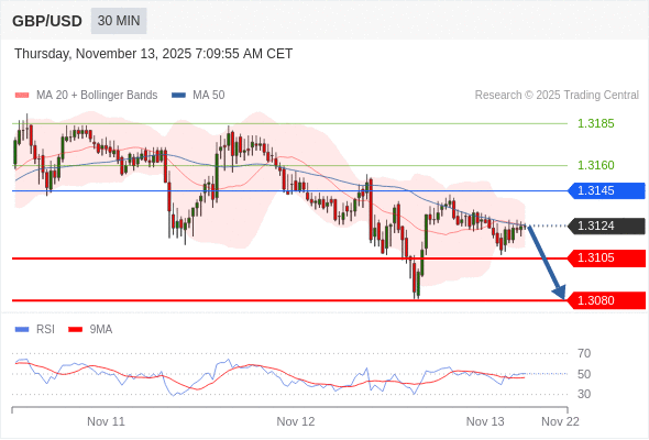 在 1.3145 之下,看跌,目标价位为 1.3105 ,然后为 1.3080 。