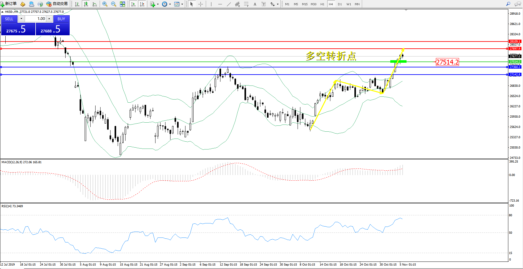 香港恒生指数11月5日(周二)收盘上涨136.10点,涨幅0.49%,报27683.40点;随着美联储不断降息,人民币有了升值的机会,近期人民币持续升值,离岸人民币兑美元日内涨幅扩大至375点,现报6.9967。在市场降息预期降温之际,突然宣布“降息”!11月5日,央行发布公告称,当天开展中期借贷便利(MLF)操作4000亿元,与当日到期量基本持平,期限为1年,中标利率为3.25%,较上期下降5个基点。这是自2018年4月以来,首次调降1年期MLF利率。市场情绪持续回暖,恒指昨日也突破重要压力位,近期恒指仍然有望继续走升。