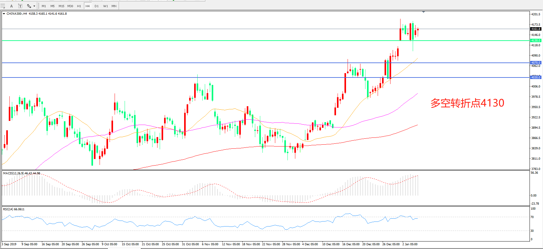 4小时图看,沪深300延续高位震荡,4130仍然是下放明显支撑,均线系统呈多头排列,MACD红柱增加,RSI指标走平,日内延续上行概率较大。