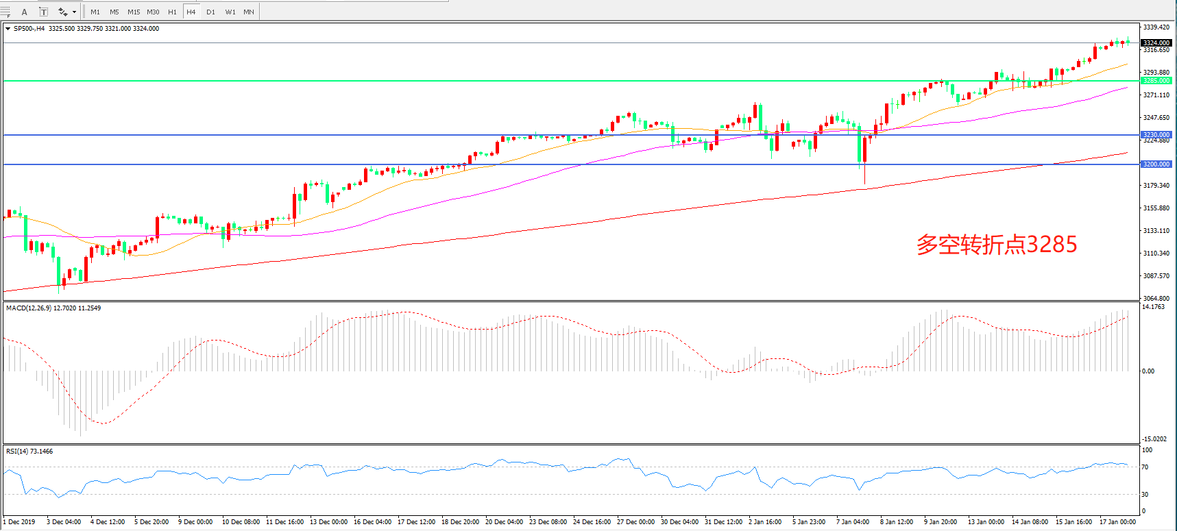 4小时图看,标普500阳线连续拉升,整体走势偏强,均线系统呈多头排列,MACD红柱增加,RSI指标向上,日内延续上行概率较大。