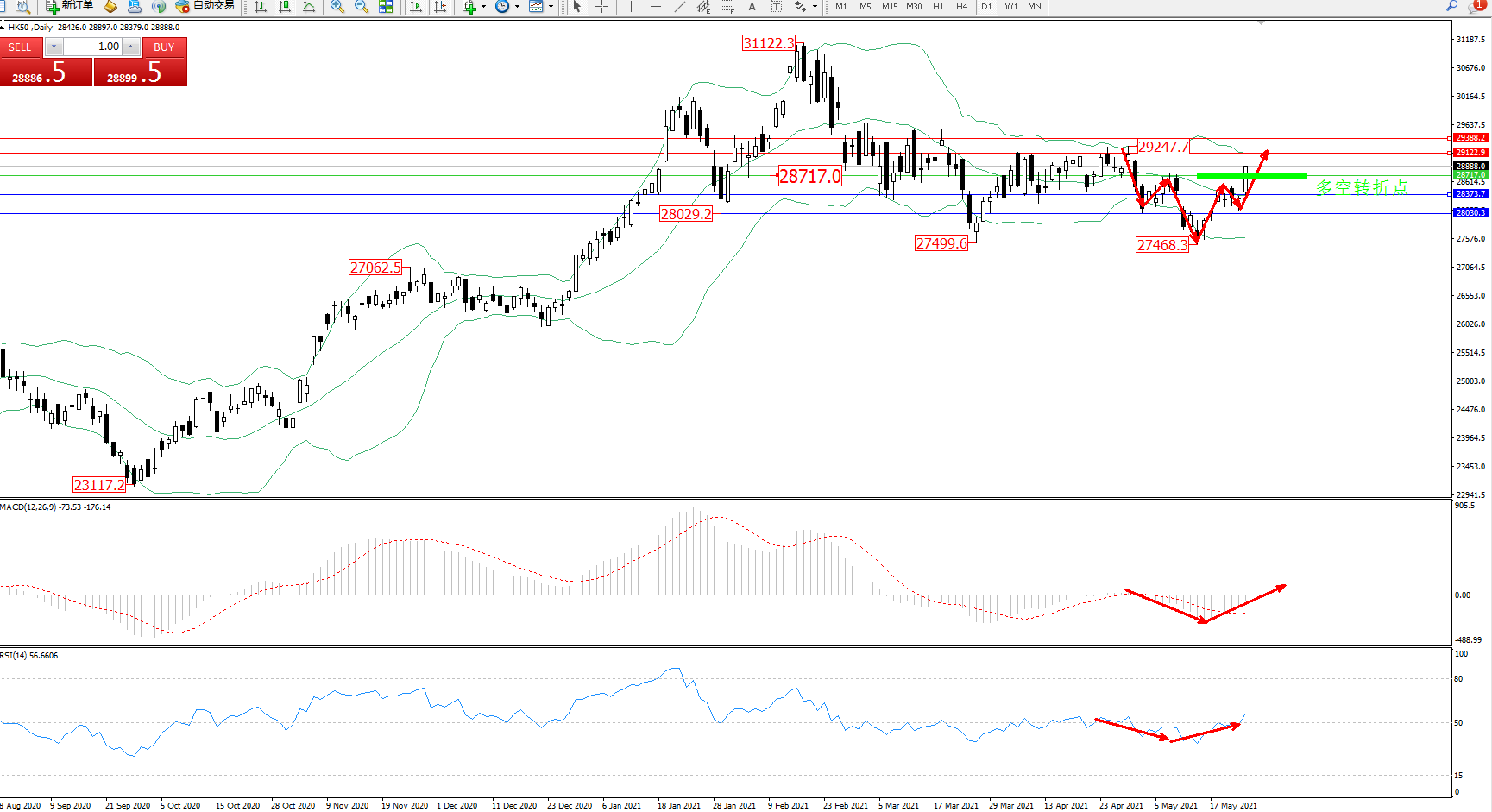 香港恒生指数5月25日(周二)收盘上涨498.6点,涨幅1.75%,报28910.86点;港股三大指数均大幅收涨,成交额大幅提升,市场情绪明显回暖。恒生科技指数涨1.62%报8004点。大金融股(中资券商股、银行、保险)集体爆发,助力大市走俏,表现十分抢眼,大型科技股普涨,小米、腾讯升超4%,美团、百度等多数上扬,教育股午后跌幅收窄,新东方在线等由跌转升。今日大市成交额放量至1678亿港元,南下资金大幅净流入87.32亿港元。南下资金今日净买入78.59亿港元。港股通(沪)方面,腾讯控股净买入16.27亿港元,香港交易所净买入5.32亿港元。港股通(深)方面,腾讯控股净买入15.65亿港元,美团-W净买入3.53亿港元。香港特区政府卫生署卫生防护中心今日下午公布,截至当日零时零分,香港新增2例新冠肺炎确诊病例,新增的2例病例均为源头不明的本地确诊病例。截至目前,香港累计确诊新冠肺炎病例11835例。LME亚洲金属研讨会在线上举办。港交所主席史美伦表示,在疫情过后的世界里,可持续发展已成为商品市场新机遇的核心。“今年,LME计划推出四款新合约,为支持可持续转型的金属提供定价及交易渠道。当中包括一款为电动车行业而设的氢氧化锂合约,以及三款可支持循环经济的废弃金属合约。”