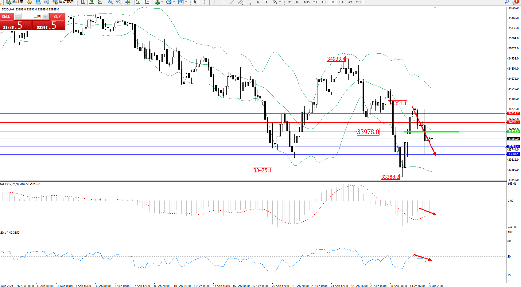 道琼斯指数10月4日(周一)收盘下跌323.27点,跌幅0.94%,报34003.19点;美股收盘,三大股指集体下挫,受通胀持续高企的威胁,科技股再度重挫。疫苗生产商的股价也因默克关于一种有效的Covid-19药物的公告而下跌;在投资者忧虑情绪升温之际,全球市场也转向避险情绪,与此同时,投资者也在准备迎接美联储最早在下个月开始缩减刺激力度。高通胀率和美国国债收益率上升使得高成长股票对投资者的吸引力下降;另外一些科技公司的盈利面临的风险也可能有所上升。