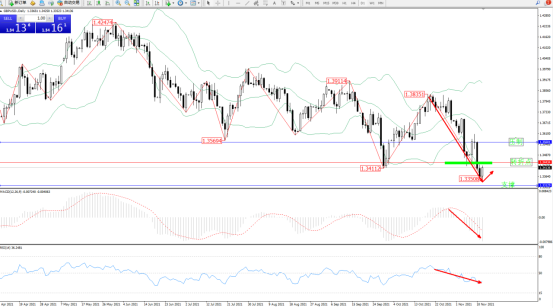 空头动力延续布林带指标通道中下轨区间持续震荡下行,低位抵达1.33508位置后短暂整理,但整体下行趋势态势良好,短期有进一步向下移动态势,布林带指标呈张口走势良好,上方压制关注1.35601位置,低位支撑关注1.33129附近,关注1.34434附近转折点,MACD指标空头动力持续震荡下挫,RSI指标处于空头区域维持整理下行中,如图: