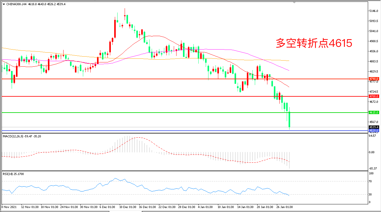 4小时图看,沪深300长阴连续下破,短期走势偏空,均线系统呈空头排列, MACD绿柱增加,RSI指标走平,日内或有小幅反弹,但下行趋势较为明显。