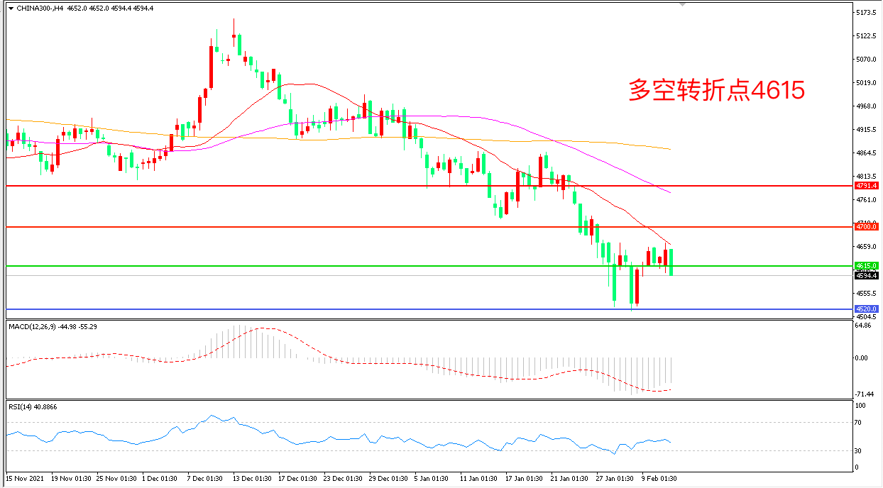 4小时图看,沪深300长阴下破,短线走势较为低迷,均线系统呈空头排列, MACD绿柱缩短,RSI指标走平,日内延续震荡概率较大。