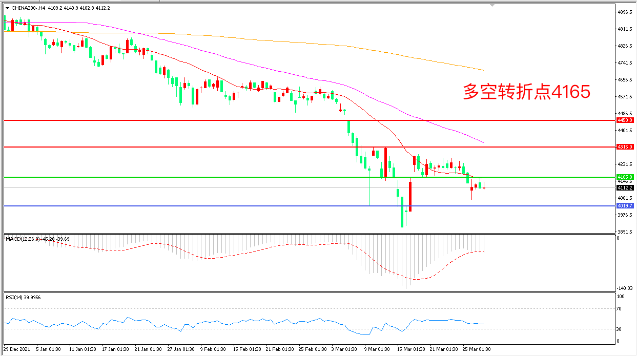 4小时图看,沪深300跌破4165后窄幅震荡,整体表现低迷,均线系统呈空头排列, MACD绿柱增加,RSI指标走平,日内震荡下行概率较大。