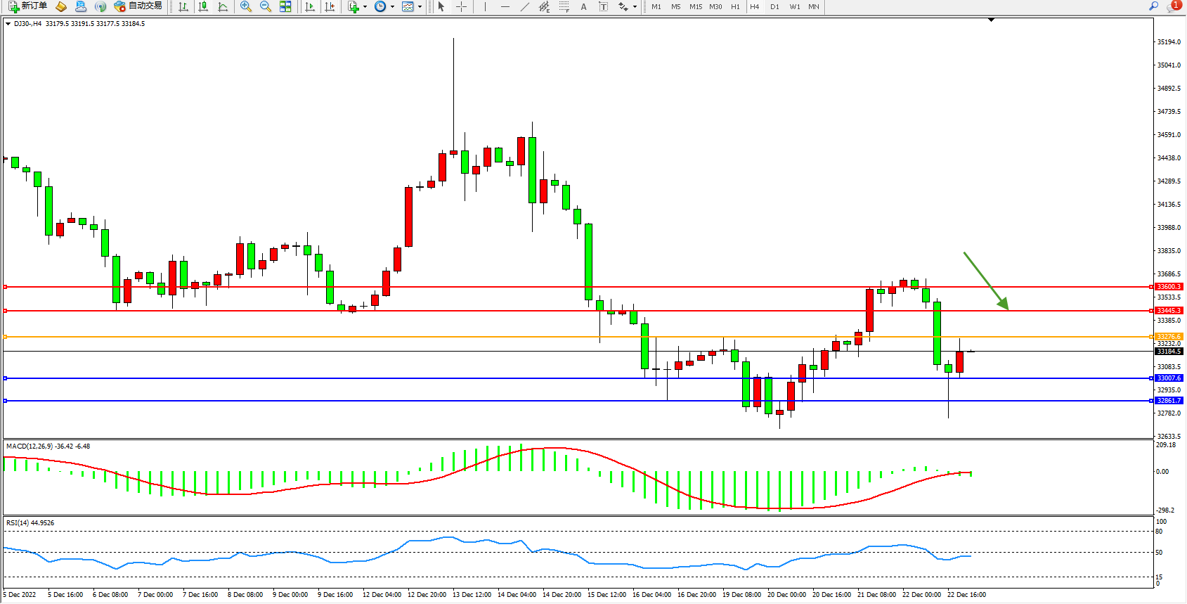 道琼斯指数12月22日(周四)收盘下跌348.66点,跌幅1.04%,报33027.82点;美国第三季度实际GDP年化季率终值:第三季度的周总工作时间折合成年率增长了2.9%,而第三季度的实际GDP增长率目前为3.2%,这意味着我们在第三季度至少获得了一点生产力增长,这与今年上半年相反。