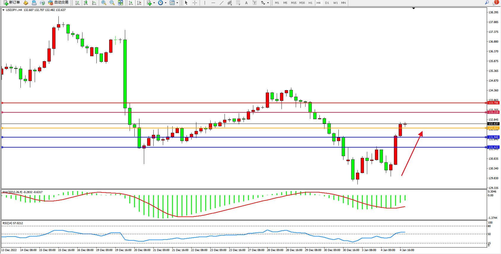 4小时图看:多头动力强势拉升,市场看涨情绪涌现,短期多头有继续向上移动迹象,MACD指标处于空头区域整理上移,RSI指标处于50均衡线上側弱势徘徊;