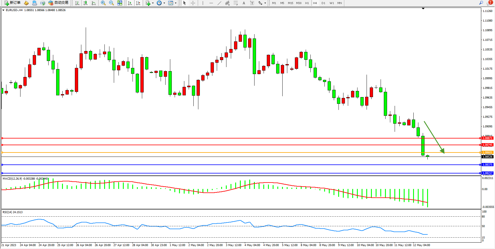 4小时图看:空头动力低位下挫,短期跌势未见止步,市场空头情绪笼罩,MACD指标处于空头区域持续下行,RSI指标处于空头区域低位下移;