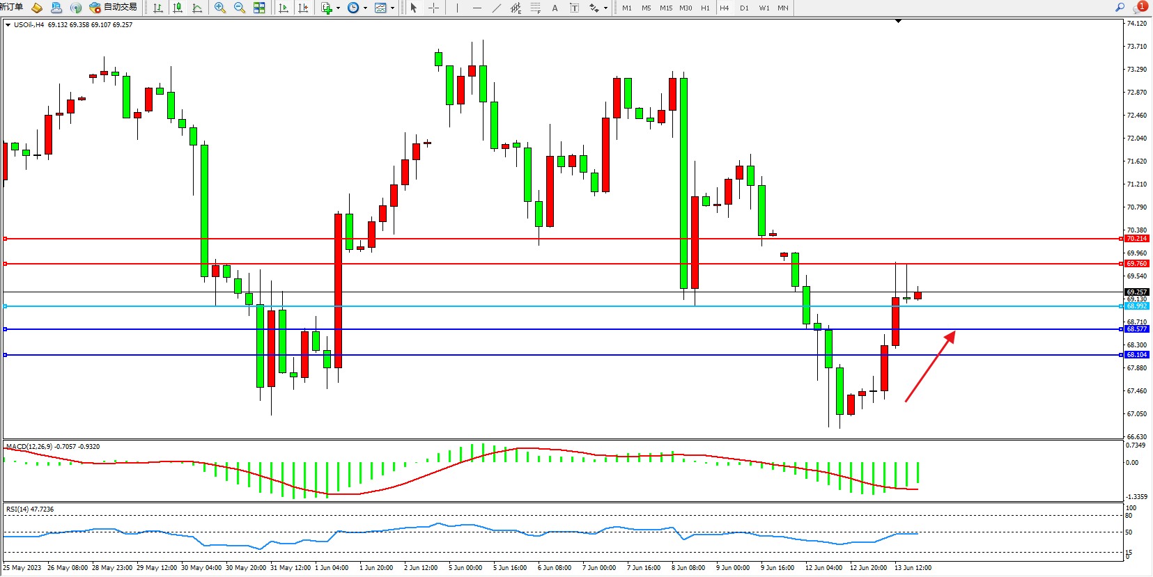 交易策略:68.992上方看涨,目标69.760 70.214