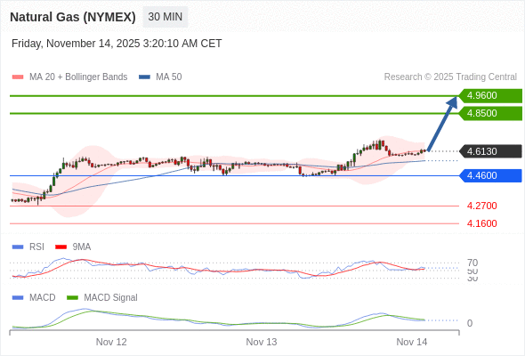 Natural Gas (NYMEX) (DEC5) 当日内: 看涨,当 4.4600 为支撑位,目标定在4.9600。